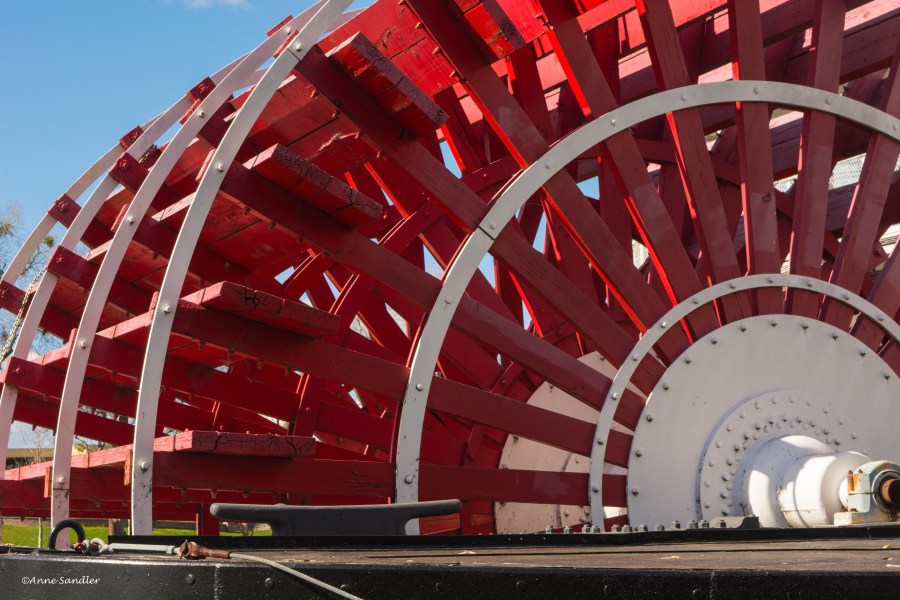 The paddle wheel on the Delta King, a hotel and restaurant ship.