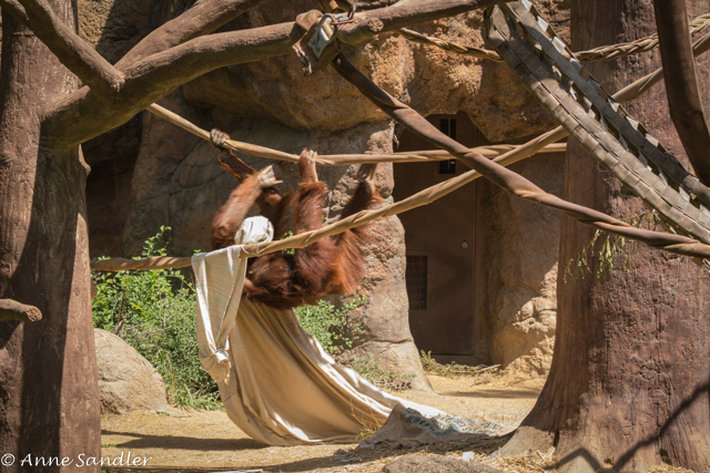 When we arrived at the orangutan enclosure, they were all inside. Finally this one came out with a tarp. Previous image Next image