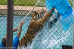 The toys are inflated and held at the end of a long pole. The handlers could pet the tiger, but do have to be careful during play.