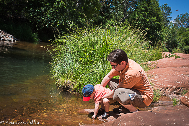 A dad helps his son test the waters.