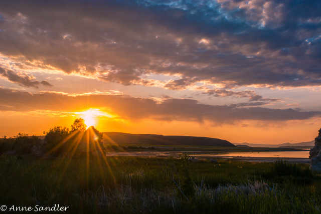 A sunburst peeks through the mountains and Tufas.