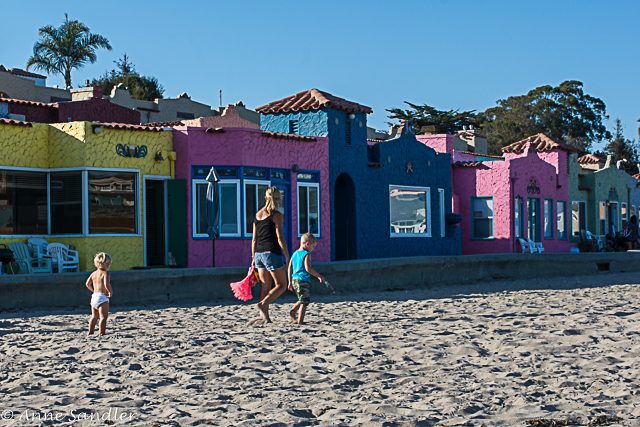 Mom and kids walking past the row of colorful houses.