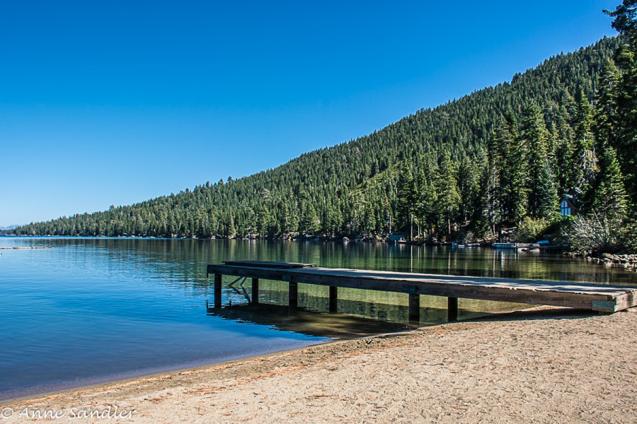 A view of the lake’s beach and pier.