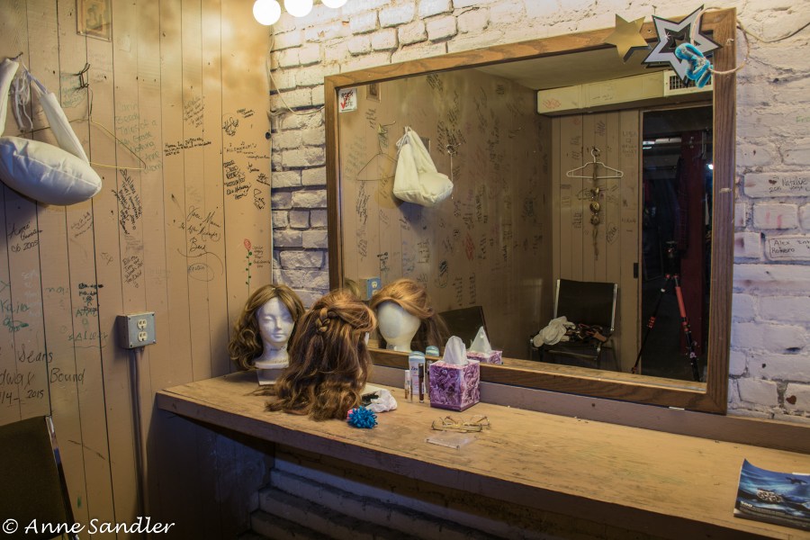 The notes on the dressing room walls were put there by actors and will never be washed off. Previous image Next image