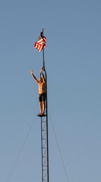 I don’t know how high this ladder was, but this guy was determined to show off before he jumped. I’m not sure what he jumped into, but I’m thinking air bags.