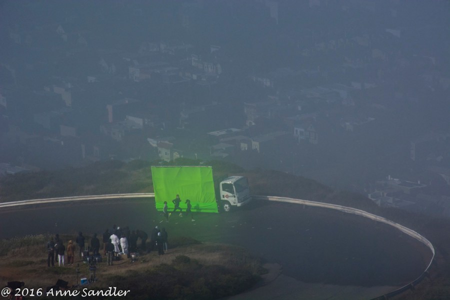 They were filming a commercial and had to use a green screen because of the fog. Previous image Next image