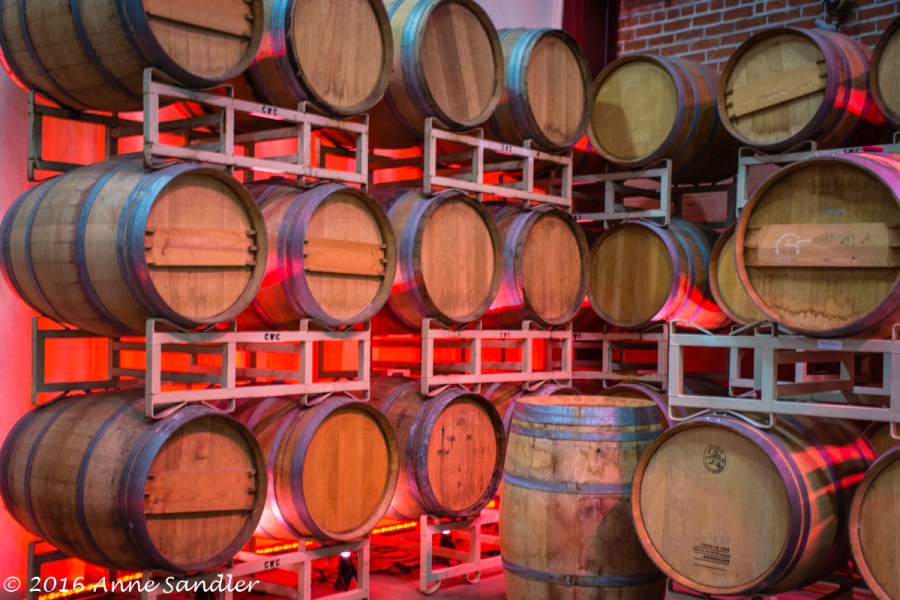 I loved how the red light cast on these barrels inside a winery room.