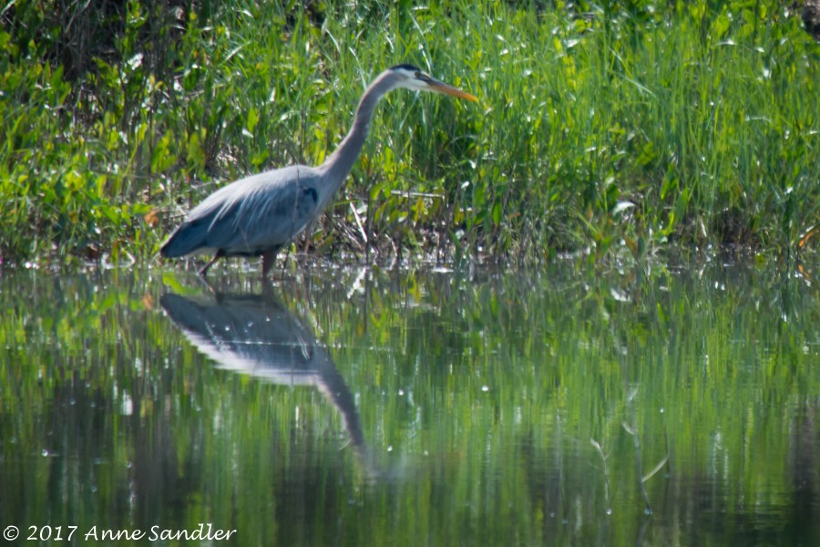 A great blue heron is fishing.