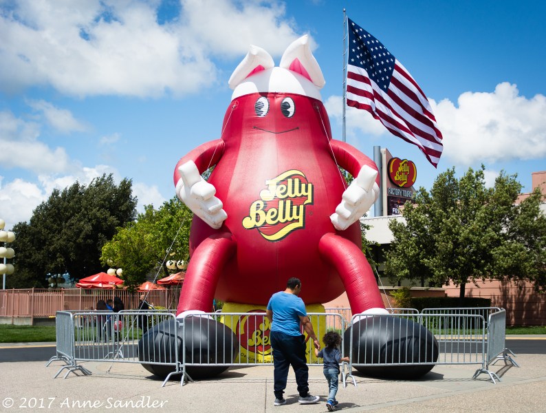 A dad and daughter gaze at the giant jelly bean outside the entry.