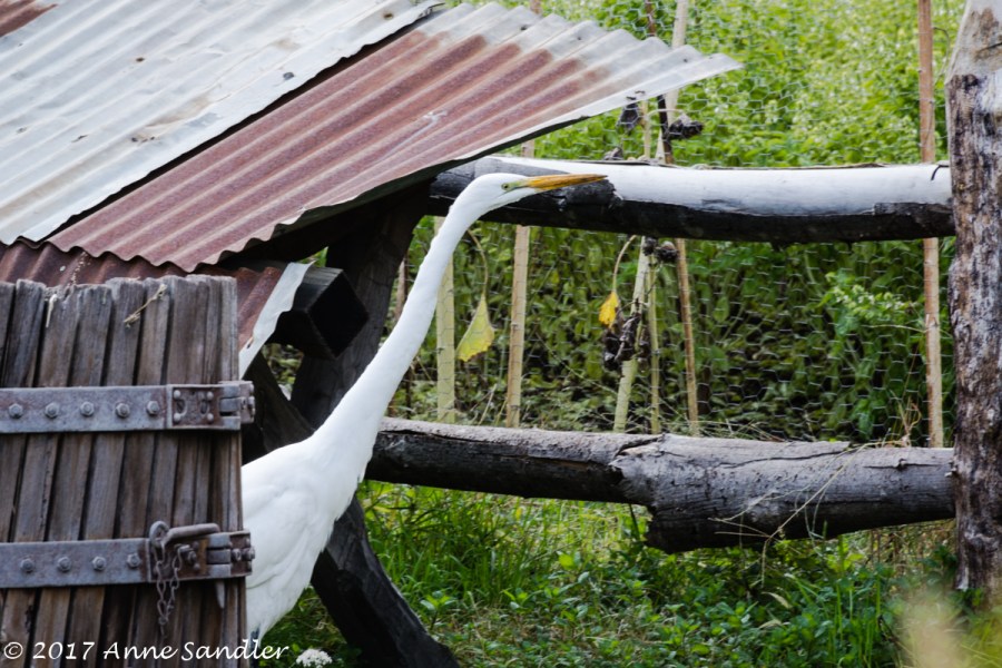 An egret came out from under a small shelter.