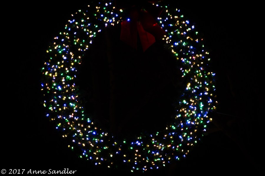 This was a wreath that was hanging from a wire going across the street. Below it, was a string of lights. The following zooms are of this wreath.