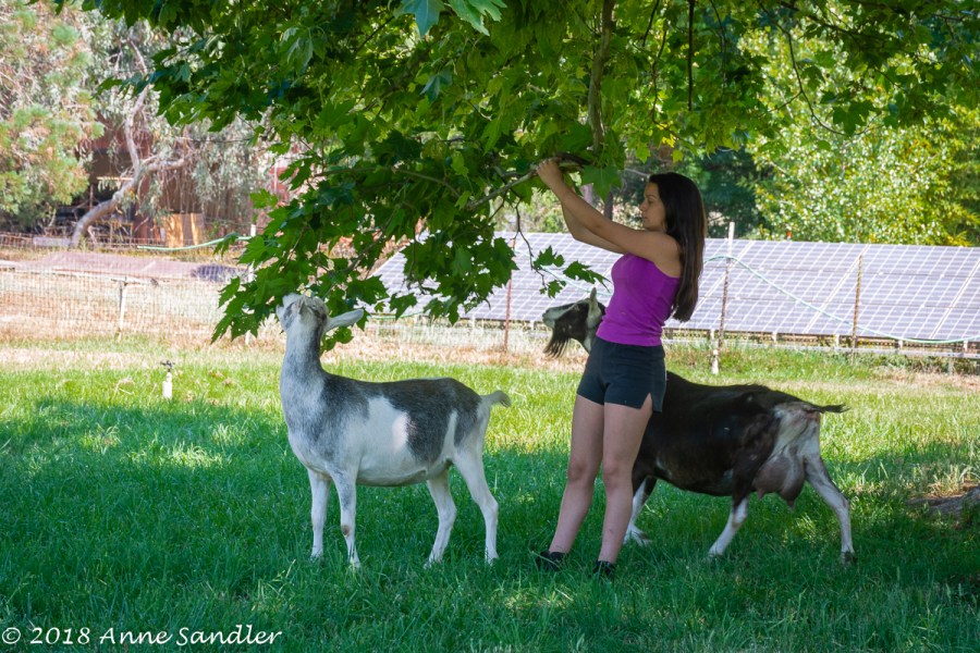 Gabby is pulling down a branch for the goats to chew on.