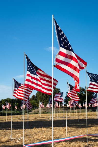 Flags, large and small, are carefully placed.