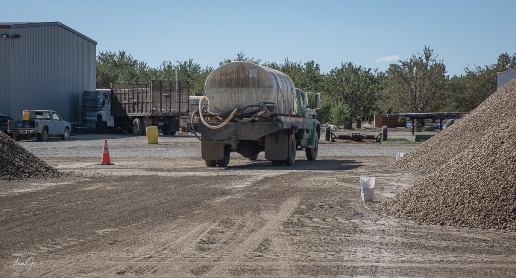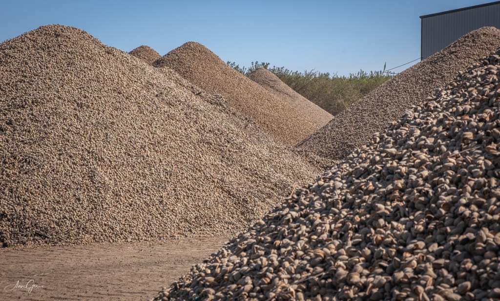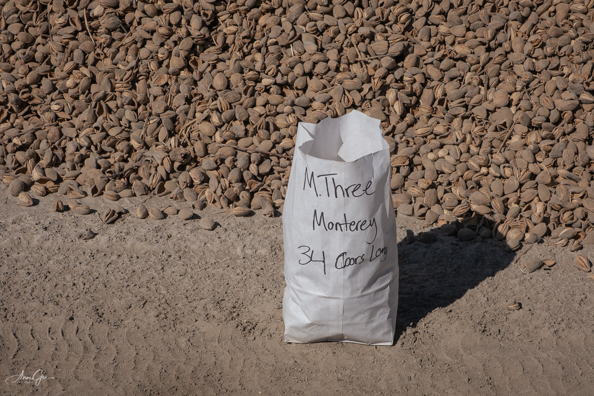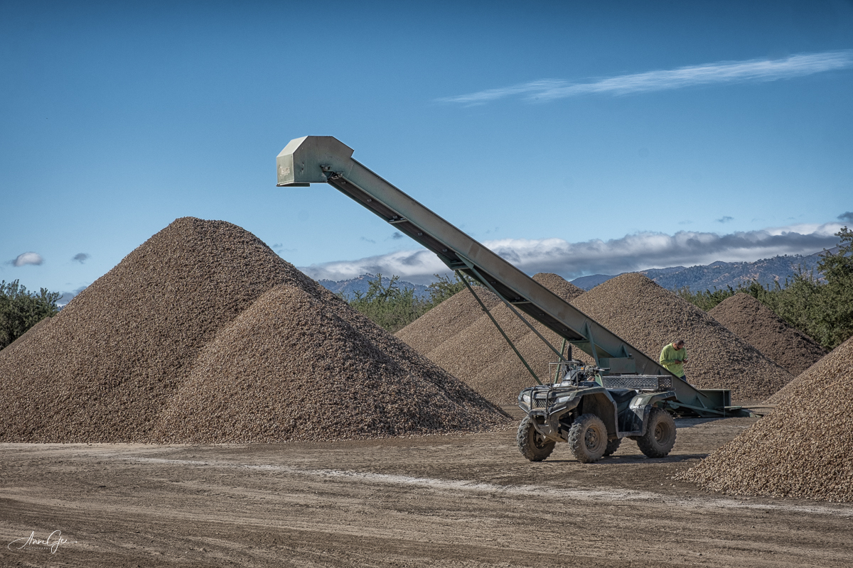 Then I found where the almonds were getting ready for shipping. There were large mounds of almonds everywhere with bags to mark where each were to be delivered. It was a treat to catch the large machine as it dumped almonds on the mound.