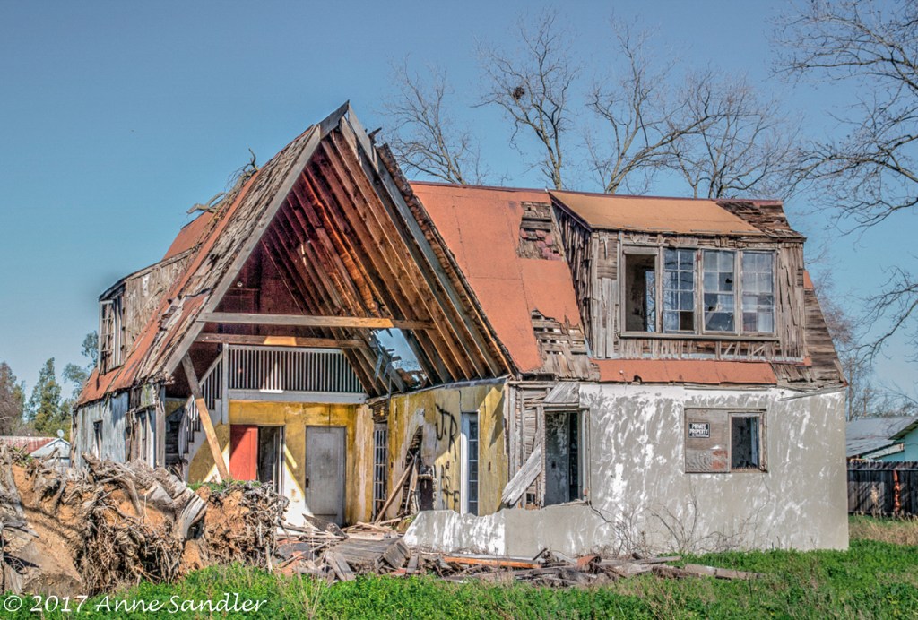 On one of our farm trips, the buildings, except for the family home, were left to do their natural thing. Here are steps of the interior of a building and the window of another. Also the “Spirit of Sacramento” has been left to die a natural death. She’s usually on the dry ground, but at this point it was a rainy winter and she’s in a large puddle.