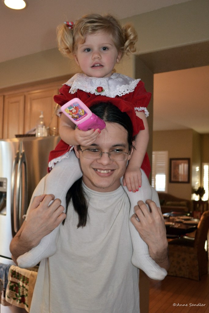I love this picture even though it is poor quality.At Christmas. Olivia is wearing her pretty Christmas dress while riding on Christopher’s shoulders.Our first zoo visit. Another favorite picture.Olivia wearing her Christmas dress while riding on Christopher’s shoulders.Ryan decorating his grandfather’s face!