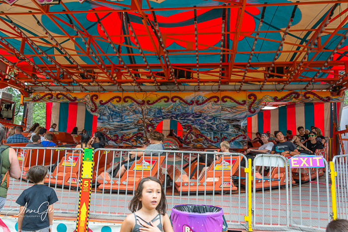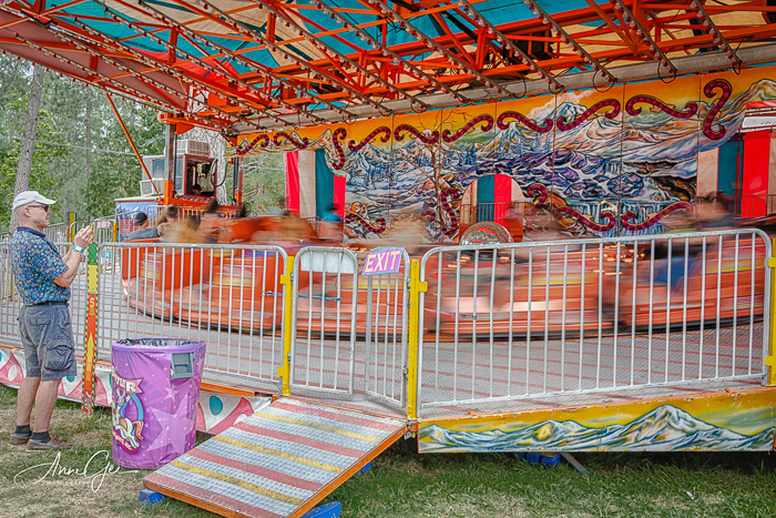 A ride at the Nevada County Fair. This is a kids ride of cars that starts off slowly and then increases to a rapid spin. Picture one is stationary, two is starting the spin, and three is at maximum.