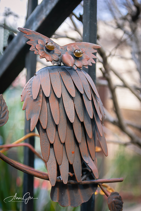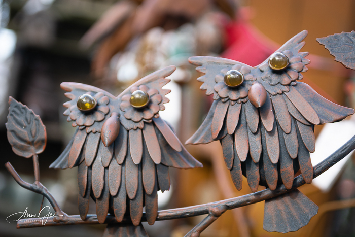 Yard art. For my last trio, I’m taking you to the Antique Trove in Roseville. We go there when we need to be indoors because of rain or heat. It was rainy, but the back part (yard) was open. I saw cute owl sculptures.