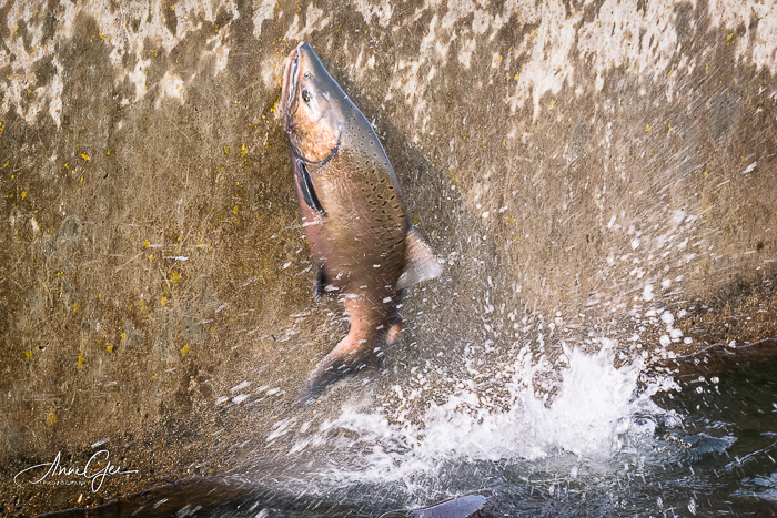 As I progress through my own photographic ability, I’ve learned that the things we photograph are also progressing. Some works in progress repeat year after year. For instance, the salmon swim upstream in the American River to lay their eggs. The Nimbus Fish Hatchery, raises Chinook salmon and steelhead for release to the American River. The salmon run occurs in fall, with hatchery operations taking place from the beginning of November through mid-December. The steelhead trout run occurs in winter, with hatchery operations taking place from January through February. In this series of images, the salmon are being diverted into the hatchery.
