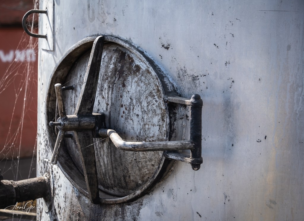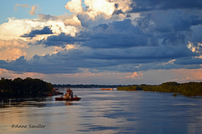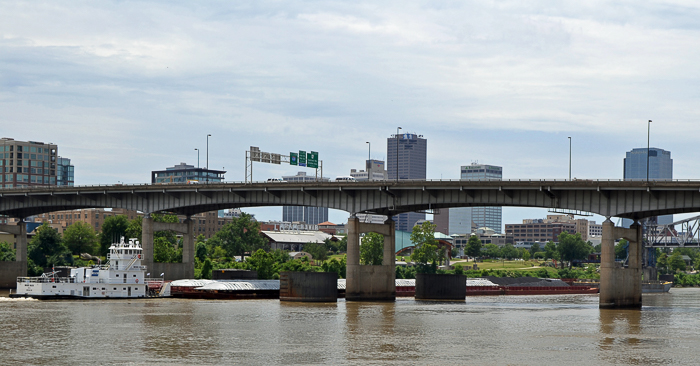 The Mississippi River is heavily used for transporting containers on barges moved forward by push boats. This image was taken in Arkansas along the mighty Mississippi. If you look in the mid to upper right, you’ll see a barge with containers on it waiting to be pushed to its destination. The second image shows a push boat in action. We were told that the crew stay on the boat the entire trip, moving 24/7, and only docking for supplies.