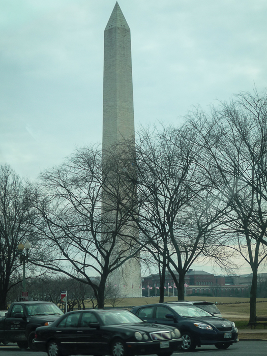 The Washington Monument towers above the tree line at the Capital Mall in Washington DC. This was taken just before President Obama’s inauguration and from a car window.