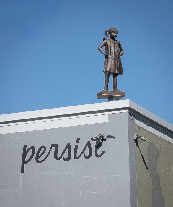 A sculpture of a small girl standing on a TALLish building, inviting you to be persistent.