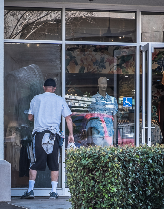 A very much alive window washer next to a store window mannequin. Taken at a local shopping center just before the stores opened. There are also a lot of reflections.