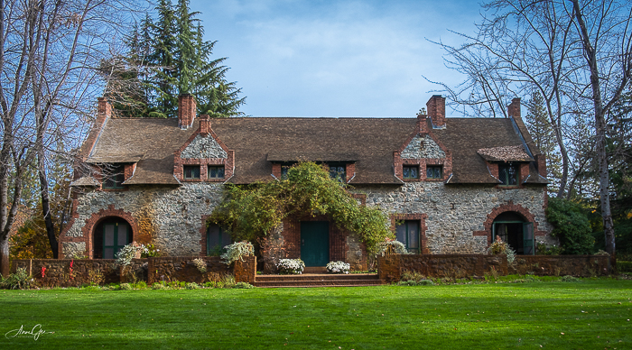 Below is the cottage front, back, garages, reflecting pool and some of the grounds. They also had a terraced rose garden and a clubhouse. I was lucky to talk a docent into giving us a Cottage tour while he was there, but no photos.