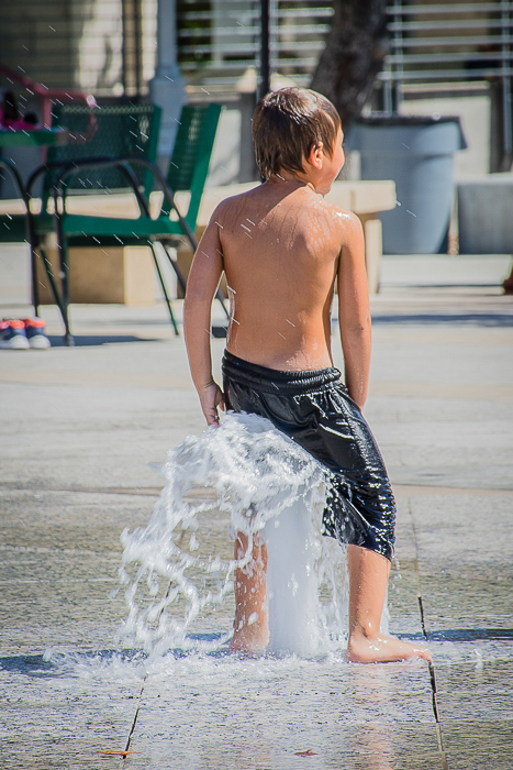 Summers can get hot in the Sacramento Valley. Many cities have fun water parks for the kids. This young man is cooling off in a Roseville water feature.