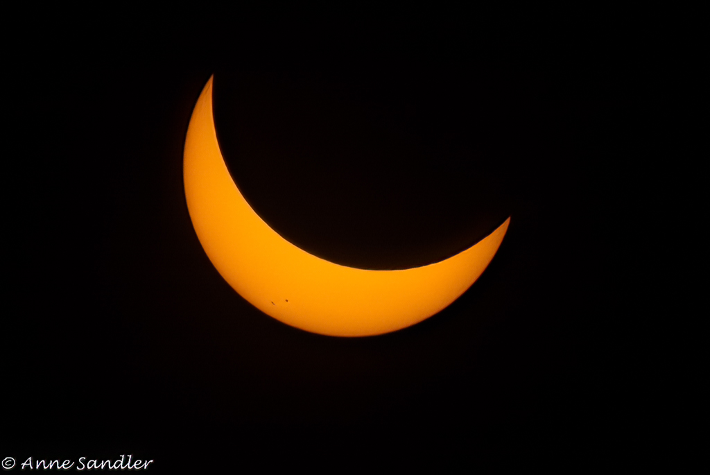 Eclipse day arrived. I perched the 3100 on the tripod while Richard had his sun scope ready to go. The moon was about to cover the sun, but I couldn’t find it while the camera was on the tripod. I wasn’t going to miss this. Off came the camera and I shot the eclipse hand held.