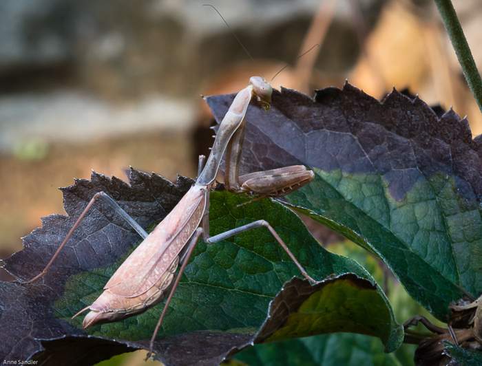 Also on this same outing, Marlene spotted a couple of praying mantises. It was amazing that when they feel threatened, they just stay still. The green mantis wasn’t camouflaged on the white flower, but the brown one had a better background on the brown leaves.