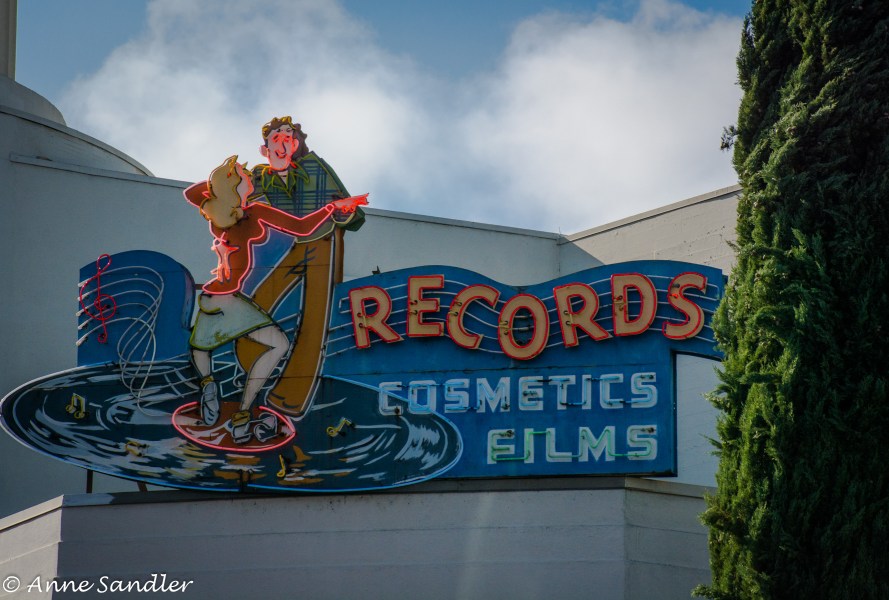 Now Dimple Records is in that same place, the Tower Cafe, which opened in 1990, feeds movie goers and the Tower Theater stands above the tree line with it’s art-deco design.