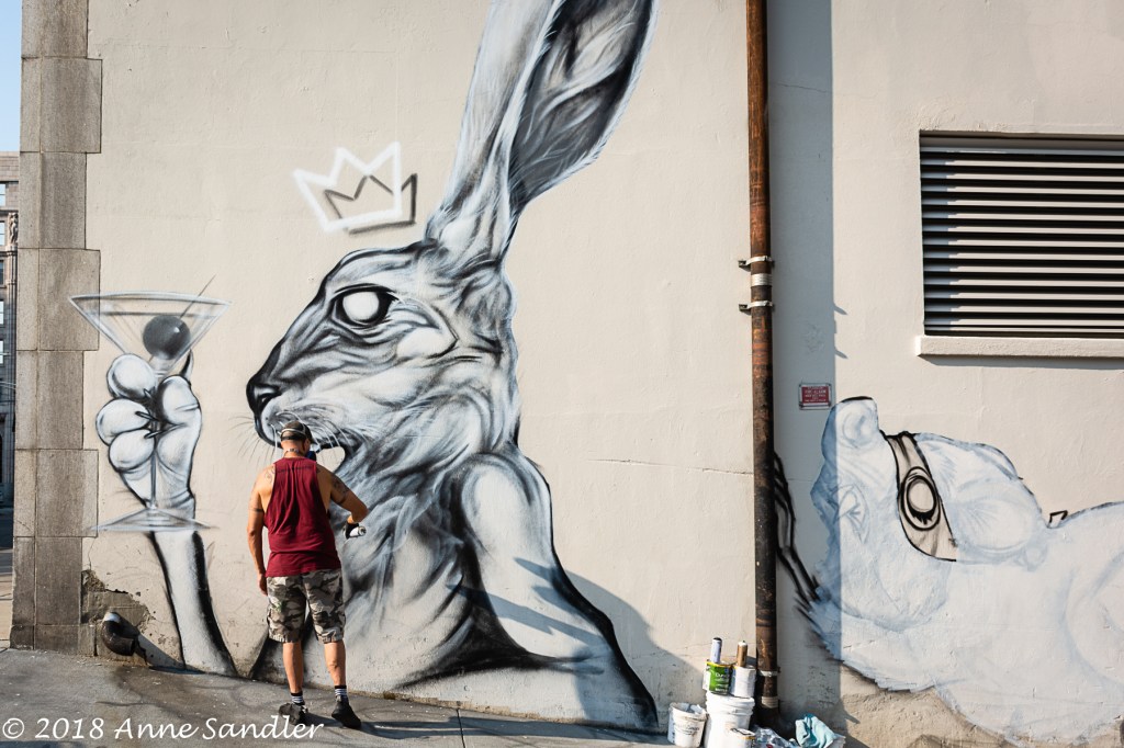 Since I rarely get out for a sunrise, mid morning is the time you’ll find me out shooting. Here’s a picture of a painter doing a mural during Sacramento’s Wide Open Wall festival. The sun was in position to show his shadow on the ground and on the wall as he’s painting.